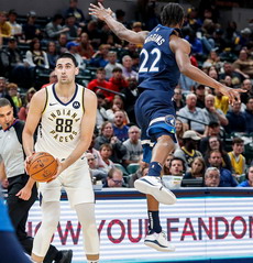 队友T.J. McConnell是他第二组别挡拆的最佳搭档,T.J. McConnell评价:“他(Goga)在许多方面影响着比赛。能打关键时刻的球员都攻守兼备,而Goga就是这样的球员。倘若他积累了足够经验,他就不会被打得找不着北了。事实上,他的投射、持球攻还有护筐,只要火候到了,他在联盟绝对是有所作为的。他在练习其实都是这样,队友们都很喜欢和他打球,所以今晚我们对他的表现并不惊讶。” 狗哥第一节尾端上场便瞬间点燃场内气氛,引起球迷一阵欢呼。(严格意义上,他的Fieldhouse首秀是昨晚的球迷派对,他穿了马里奥的行头高歌一曲)。第一次挡拆接Edmond Sumner弹地回传后,Goga马上融入比赛节奏,完全无惧篮下对抗,以一记娴熟的中路抛射开糊。 除了技巧以外,Goga也在场上展示出了足够的沉着。可能是明尼苏达没做狗哥的功课,第三节居然让他连续两次在右翼射入空位三分。第一球他是眼睁睁地放了扑出来的Andrew Wiggins飞机,然后再回头望一下对手,才三分出手命中。第二球同样位置,对手扑上来之前他就已经出手了,反超比分,场边的球员已经全体乐翻了,然而狗哥却镇静自若,淡然处之。 在赛后采访中狗哥说:“我必须专注打球。不能轻易被比分左右情绪。但是看到我的队友这么激动,我也很开心。” 狗哥今夜对位的是连续两年的全明星球员Karl-Anthony Towns,下半场被对手在禁区和三分线外上课,Towns全场轻松轰入30分,下半场如入无人之境。即便被虐,狗哥也不胆怯:“我上场了就该防谁防谁吧,我也不管对方是何方神圣。可能(Towns)是牛人,但是我尽力了就行。” Myles Turner在赛后也给队友鼓励,“不能再好了!首秀就跟全明星对位,如果你能守住全明星,你就能守住联盟里其他的狠角色。他还有很大的进步空间,但是这场已经够好了!” 教父Slick Leonard今日看了狗哥首秀后,高度赞赏他的表现,认为这个小子日后一定大有作为。虽然大家对他信心满满,但是狗哥自己还是表现出了新人常有的紧张:“一开始我其实是有点紧张的,但是我的队友和教练一直帮助着我,能够回到场上比赛实在是太好了!” 事实上,这是狗哥4月以来的第一场实战。由于夏季联赛签证问题和印度行的脚伤缺阵,他的身体状况仍然不能适应长时间作战。所以他的上阵时间都是6分钟左右就必须下来。而今日他其实还有4个犯规6次失误,所以狗哥自己倒是非常谦虚:“我仍旧需要一段时间来习惯,我们一起看看吧!” 不过可以肯定的是,狗哥已经具备打轮转的实力。 另一个可以有轮转实力的,应该是T.J. McConnell。他今日交出10分8次助攻,尤其是第二节被对手拉开13分之后,T.J. McConnell死缠烂打的防守加上火候十足的借机突破,多次撕开了客队防线,分球到位,偶尔突袭,半场前Pacers已经将大坑抹平。 昨天Nate McMillan在点评T.J. McConnell时就坦白:“我们在招募他时,就讲得很清楚,Aaron(Holiday)估计会是第二控卫。他来这里不是为了抢上阵时间的,他也知道自己是第三控卫,但我们想他鞭策我们的其他后卫。” 显然,T.J. McConnell几乎是在给Aaron Holiday上课。Aaron Holiday今晚虽然交出9分4次助攻,但是他12射3中,效率堪比夏季联赛。从四场热身赛表现看来,Aaron Holiday的表现不但在T.J. McConnell之下,甚至还不如Edmond Sumner,后者突破凌厉今日交出11分4助。 今日Nate McMillan赛后也说:“我们今晚其实蛮需要(McConnell)的冲劲的,我们上半场两套组别都无精打采。他带着我们所需的能量进场。现在我们的轮转阵容都还不是死的,上阵时间都是大家争取的,我喜欢他带的节奏。” 今日Nate McMillan收起五个先发,没有一人上阵超过17分钟。Domantas Sabonis半场11分13个篮板是先发球员最好的成绩。球队打完最后一场热身赛,一周后揭幕战打响,对手是底特律。